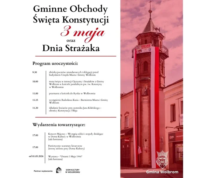 Od 1 maja 2026 r. można też oglądać wystawę „Ostatni 3 Maja 1946” w sali lustrzanej Domu Kultury. Partnerem wydarzenia jest właśnie Dom Kultury w Wolbromiu, który dopełnia obchody o część kulturalną i edukacyjną. Dzięki temu święto nie kończy się na oficjalnych gestach – dostaje też przestrzeń na rozmowę o historii i wspólne spędzenie czasu.