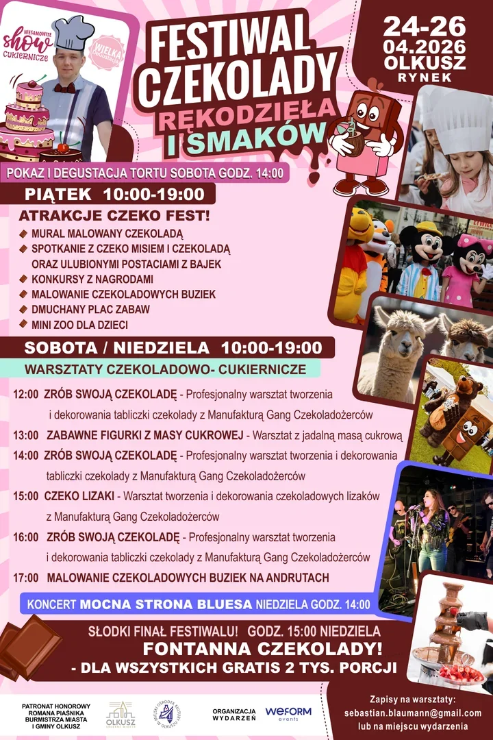 Największe emocje organizatorzy zostawiają na finał. W niedzielę o godz. 15:00 na Rynku ma stanąć fontanna czekolady, a dla uczestników przygotowano 2000 bezpłatnych porcji. Zapisy na warsztaty prowadzone są mailowo i na miejscu wydarzenia. Za organizację odpowiada WeForm Events we współpracy z Miejskim Ośrodkiem Kultury w Olkuszu.