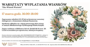 Pod okiem prowadzących zamienisz suszone kwiaty, gałązki i naturalne dodatki w trwały wianek — idealny jako dekoracja ściany, drzwi czy okna. Warsztat odbywa się w ramach działalności Młodzieżowego Dyskusyjnego Klubu Książki, więc po części rękodzielniczej może pojawić się też luźna rozmowa w klubowym klimacie — aktualnie klub dyskutuje o książce Igrzyska śmierci: W pierścieniu ognia.